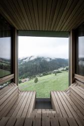 The two levels are characterised by a different treatment of privacy, with mainly exposed spaces above and protected spaces below. On the upper floor are two whirlpool baths, two panoramic showers and a changing room. The lower floor houses the foyer, which has access to the soft sauna, the Finnish sauna, a shower cabin, an ice mist shower and a third outdoor pool, from where one's gaze can sweep over the surrounding landscape.