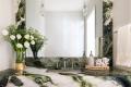 Careful detail is evident when observing the natural banding of the marble vanity—the artisan shows intention with how beautifully aligned the cut is in tandem with the direction of the banding. The overall look of the room has an uncommon “cosmopolitan flavor” that demands attention as a work of art.