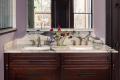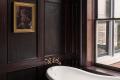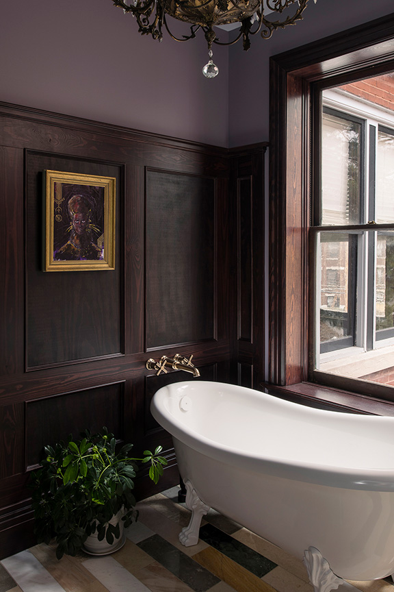 Artistically inclined homeowners envisioned a primary bathroom that honored the architectural heritage of their Tower Grove East home, while embracing bold choices in material and color. Staying true to the home’s early 1900s roots, modern elements are layered with industrial brass plumbing fixtures set against dramatic Viola marble countertops and carved Carrara wall tile. Pressed glass lighting, a new clawfoot tub, rich stained wood paneling and a carefully sourced vintage chandelier add period-appropriate charm and texture, striking a thoughtful balance between old and new.