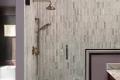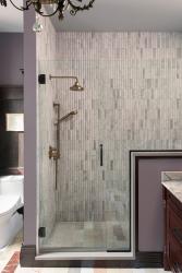 The vintage bathtub and fixtures are integrated well with the modern feel of the color palette chosen. Attractive wainscotting adds to the elegant charm of the space and provides texture that matches the vanity drawers. Additionally, the spacious shower provides a touch of practicality and versatility that makes this bathroom well rounded in its design.