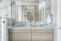 This primary suite was part of a large renovation for a young family of doctors with two children. They both sought a soft, sleek aesthetic, but her Brazilian background influenced some exciting choices. The white painted barn door with a large inset mirror reflects a window and striking floor-to-ceiling European white oak linen cabinets with can inserts and ample storage. The engineered stone countertop features a low backsplash with rounded side splashes that reference the shapes of the vanity’s inset drawer pulls, sink cut outs and vanity lights. Graphic porcelain tile is paired with authentic marble skirting, a stunning picket Carrara marble mosaic on the floor and marble chair rail around the mirrors. The warm white walls and taupe ceiling bring warmth and depth and accentuate the marble veining. The shower features a tiled trough drain, double shower head and rain shower head, with a hidden niche within the knee wall, giving this bathroom plenty of practicality as well.
