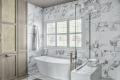 Every feature of this bath proves to be intentional and purposeful. The shape of the tub appears designed for comfort and ergonomics while every hook is thoughtfully placed. The color of the ceiling balances the weight of the cabinet while the small-scale floor tile creates a strong base texture without taking away the focus from the marble walls.