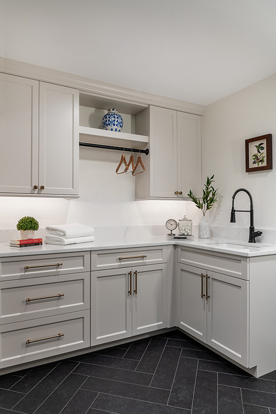 Completely reimagining a Creve Coeur kitchen and laundry room resulted in meticulous decisions by the Liston Design Build team to enhance flow, maximize storage and elevate the home’s overall livability. “We transformed outdated, underutilized spaces into a seamless blend of beauty, functionality and a visually stunning home environment,” says Liston’s St. Charles-based interior designer Jessica Hoffman. Homeowners Mike and Julie state they wanted an updated, reconfigured space in a classic design that functioned better for their family. “We love to cook and eat together. With three sons, we needed a larger kitchen,” Julie explains. Changing the smaller details, like the kitchen windows, helped achieve the more refined, intentional look that the family was aiming for. “We have incredible views of a golf course to highlight, and our Marvin windows with fewer grills help accomplish that.”