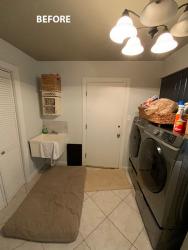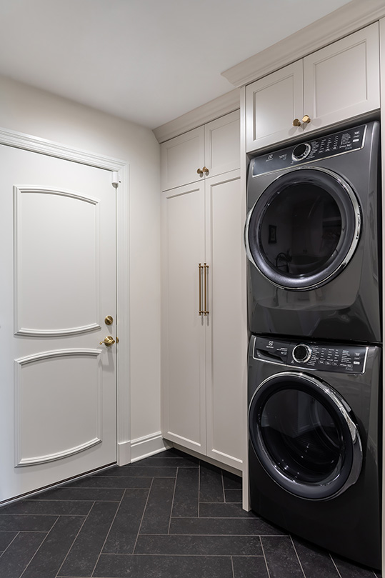 The laundry room was elevated from purely utilitarian in looks to a refined, highly efficient space, featuring expanded storage and ample counter area. The room now serves as an elegant extension of the home’s sophisticated aesthetic. For functionality and convenience, they removed an underused corner fireplace, replacing it with a beautiful powder room that was thoughtfully positioned with direct access through the newly transformed laundry room and near the exterior French doors.