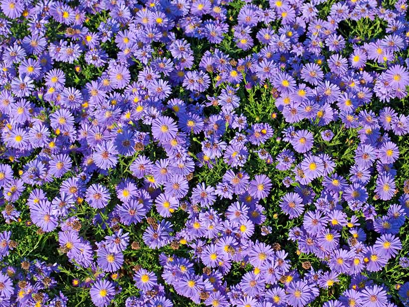 Asters can spread through naturally reseeding fast. Pinch off about one-third of total flowering stems before they bloom to reduce overgrowth and extend the flowering period. With how large they can get, aster plants may need to be divided by the root every four years.