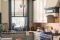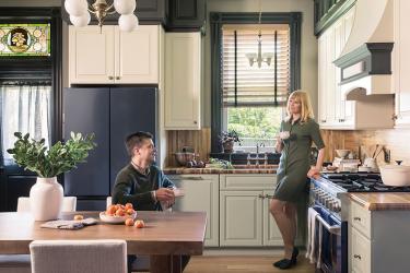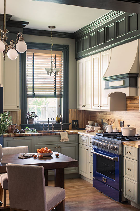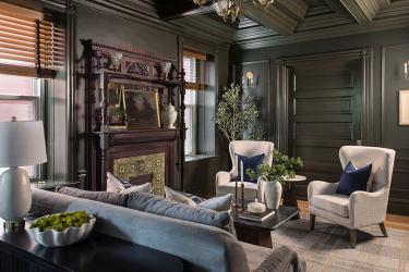 Inspired by Victorian architecture, the interior aesthetic includes elaborate plinth block bases, butterfly casings, rosette corner blocks and tall two-piece base trims. After recreating much of the existing interior millwork, Webb expanded upon it greatly for architectural drama. Soaring 10-foot ceilings allowed for more layers of crown moldings, soffits and interest boxes. The magnificent two-tiered coffered ceilings are perhaps only surpassed by the installation of a one-of-a-kind, hand-carved mantel with a fluted texture tile reclaimed from a now-demolished house in North St. Louis. Balanced by the white oak flooring they installed throughout, the couple implemented a dark, earthy and sophisticated interior paint palette that nods to the woods of Missouri, as seen in the many stained-glass Transoms.