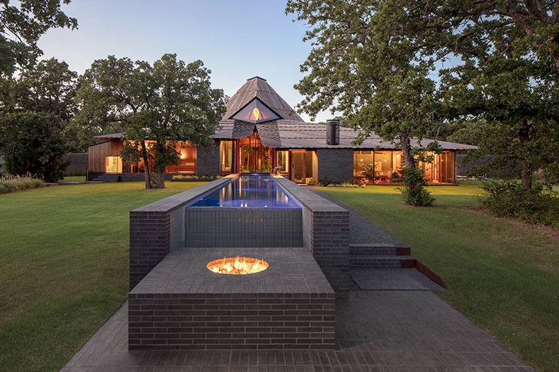 The exterior finishes with a pool, fire pit and outdoor grill, all providing plenty of space to enjoy the sprawling prairie scenery from every angle. The long reflecting pool stretches out to the edge of the woods and is aligned to the center of downtown and the tallest tower in the city—a niche touch that pays homage to the location.