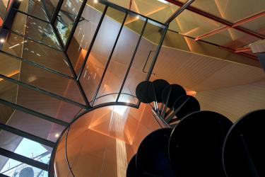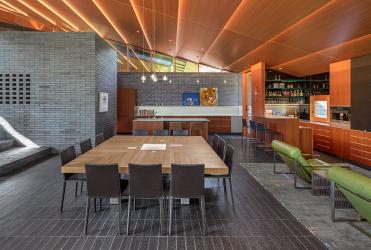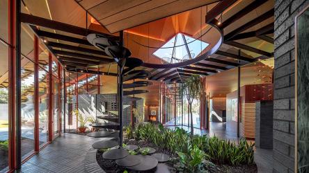 Staying true to its wild roots, Prairie Raptor is not only striking in its image as an animal nesting into the land, but also harbors its own ecosystem. In the very center of the atrium sits the “serval cat jungle,” which features a custom spiral staircase ascending to a loft from a neat rock garden, built for the homeowners’ African serval cats to roam and prowl as they please. This garden also serves to unite the home and create a center for meditation and reflection on the home’s grounded origins.