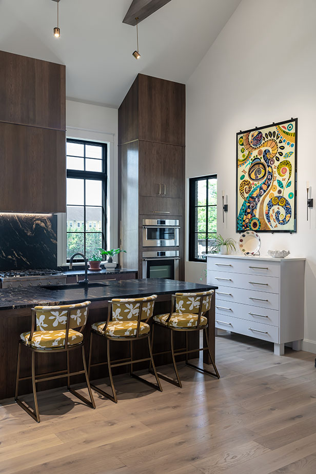 “To bring warmth, personality and a sense of joyful celebration, we wanted something special for the main gathering space, our kitchen,” explains Maryann. “Sharon designed a dramatic centerpiece for our wall, drawing inspiration from our home’s interior fabrics. She thoughtfully created a grand piece that feels both intentional and effortlessly integrated into the open main level.”