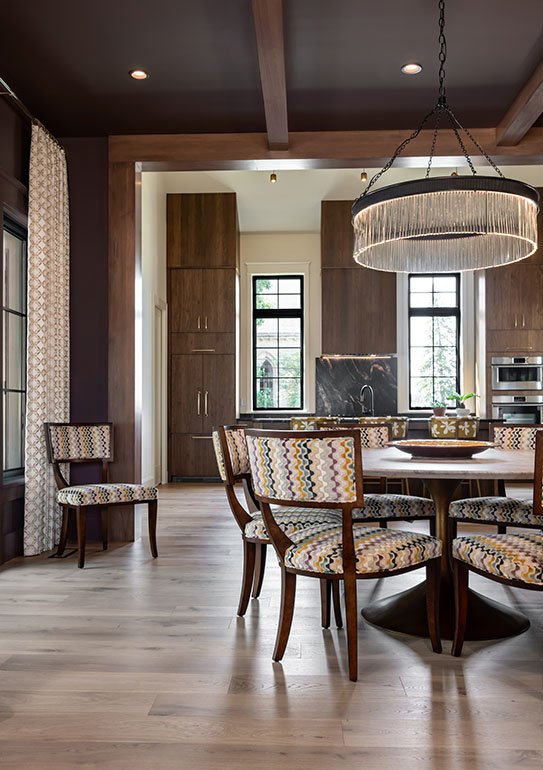After Monte’s guidance in choosing paint colors, flooring and tiles, Maryann and her designer, Susie Sheahan of Property Enhancements got to work in selecting furniture and a warm, vibrant color palette. “Developing a lively color story for this cheerful home was my favorite part of the project,” Susie says. She describes the scene with plum, orchid, gold and rich wood finishes as the driving foundation of the design. Flirty geometric and floral shapes, accented with orderly blacks and navy, as well as black and stainless-steel appliances all anchor the room and create a warm and strong space to act as the focal point of the home.