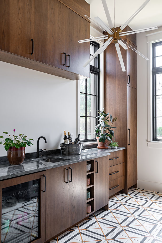 Creating an internally modern, yet “easy to live in” home was the goal, according to Maryann. They accomplished that by planning open, airy spaces with plenty of windows for natural light. Next came details that make solid use of heights to yield a functional, but copacetic and appealing, house.