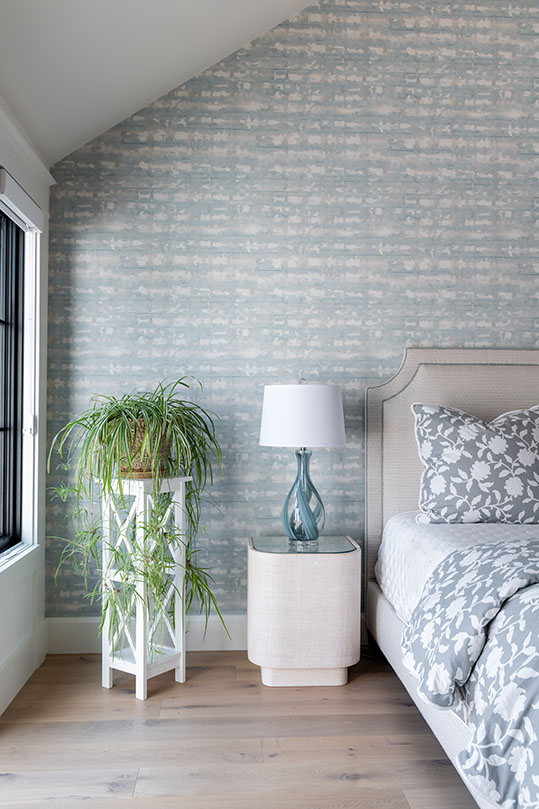 “I do love the primary bedroom,” Susie notes. There on the upper floor hides a serene retreat, filled with morning sunlight and soft blues. A tailored upholstered bed beckons as its focal point, framed by a feathery abstract blue feature wall. “Sophistication blended with a sense of sanctuary,” she calls it.
