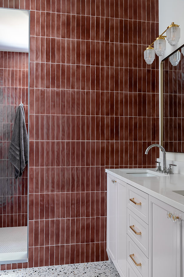 Additionally, hand-blown glass plates from Central West End-based Third Degree Glass Factory cascade up the home’s stairwell providing movement and a touch of whimsy to the space. Bold and bright, the glass plates lead the eye toward the second floor.