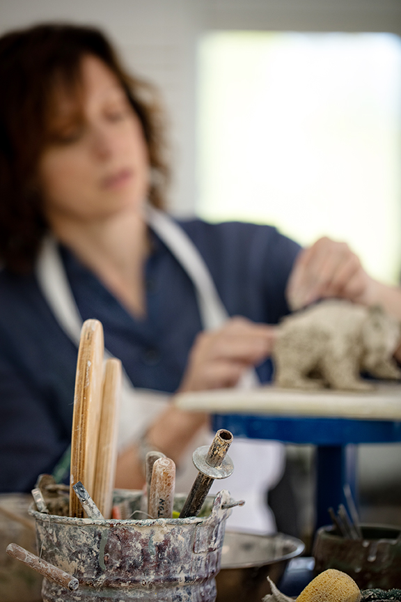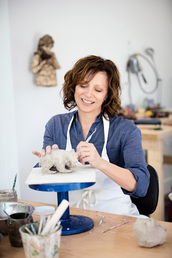 The sculptures in Lisa Hilton’s sun-washed studio are classically designed pieces, interwoven with unexpected additions of fantasy. On one side, an elegant clay woman poses on a litter made from a copper leaf, carried by a giant ant. Along the wall, another female figure cradles a metal nest, her limbs resembling the lichen-covered bark of a tree. And then there are the porcelain animals in the center of Hilton’s studio and at the heart of her current sculpture series. Each of these creatures is an amalgam of animal parts, representing the personality traits of her dearest family and friends. (Hilton’s husband, a commerical real estate broker and hobbyist carpenter, is portrayed as a tenacious wolverine with an industrious beaver’s tail and a persistent turtle’s shell.) In every piece, the literal is juxtaposed with the figurative, as if an actuary embraced her artistic side. Which, as a matter of fact, is exactly what happened.