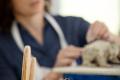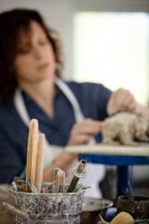 Hilton’s creative process starts with a rough sketch of the figure. Then she shapes the clay or porcelain into individual parts. Hilton studies her face in a mirror, and, for the animal sculptures, her Shih Tzu, Sparky, to work out the details of exactly how an ear joins the head, or an eye turns at the corners. She assembles the sculpture, piece by piece, slipping and scoring wet parts together over the course of a month. And then, when the design is finished and the clay is almost dry, Hilton cuts the sculpture in half and hollows it out. “That part always freaks people out,” Hilton laughs. By removing the inner clay, Hilton ensures no air bubbles will expand and crack the piece when it is kiln-fired. Hilton finishes her sculptures with a glaze, sometimes repeating the glaze-and-fire process two or three times until her desired finish is achieved. Because the glaze only shows its true color after it has been fired, it’s an imperfect science. But science, as Hilton well knows, is the other side of art.