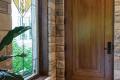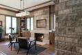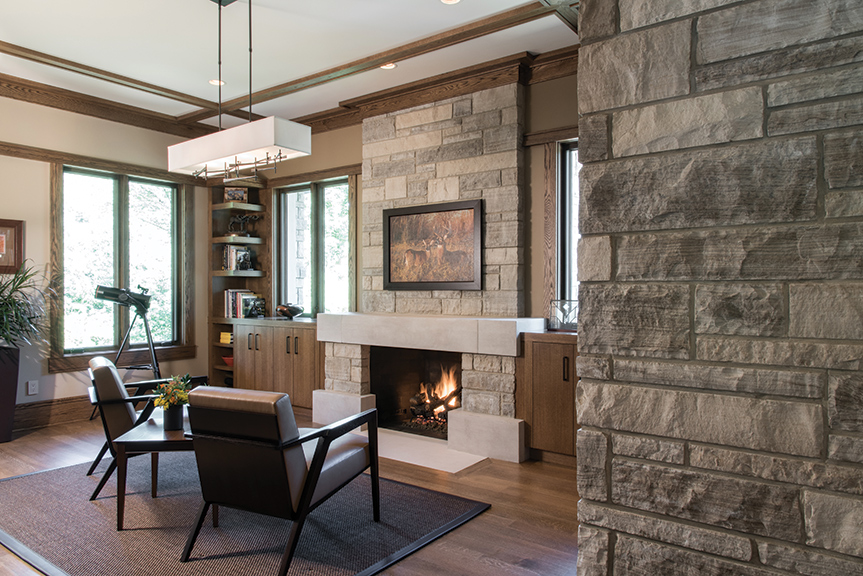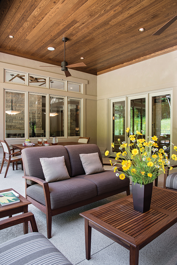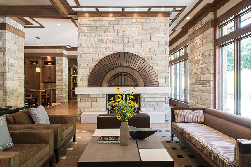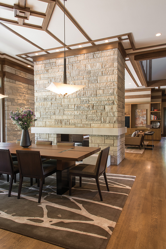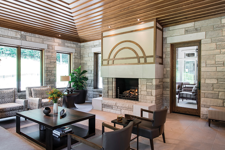 Plants flourish in the light-filled sunroom, which features a unique “layered” wood ceiling that Teiber designed in collaboration with the homeowners, limestone walls and textured stone floor tiles. Highlighted by a geometric pattern in wood, the majestic stone fireplace is actually two-sided, gas fueled in the sunroom and wood-burning in the adjacent, open-air patio room.