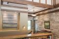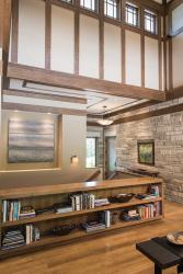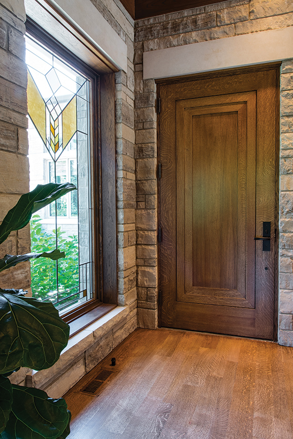An unobtrusive walkway leads to the recessed entrance, which is marked by a massive cut-limestone lintel and a spectacular art glass window – instantly recognizable as Frank Lloyd Wright’s renowned Lake Geneva Tulip pattern. Stepping through the “hidden” entry door, there’s virtually no sense of transition, except for the now-pleasant temperature. Vast banks of windows bathe the spaces in natural light and blur the distinction between indoors and outdoors. Twelve-foot ceilings, raised still higher in certain areas, enhance the spatial volume. Interior walls are blanketed with the same natural Missouri limestone as the exterior, and rich-hued white oak flooring and millwork provide a warm contrast.