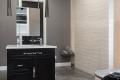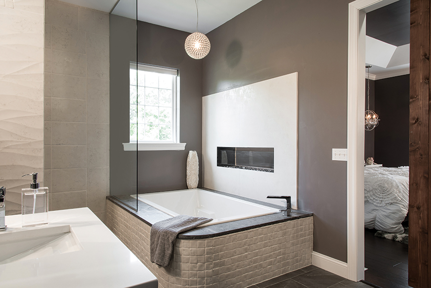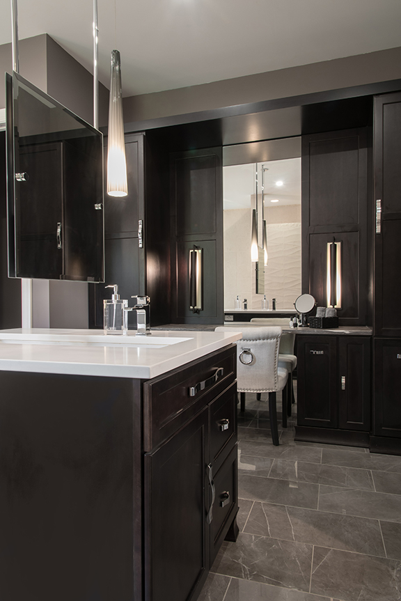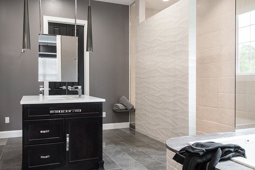 Straight lines and dark features give a masculine feel, while soft waves and curves and shiny accents brings in a touch of glam. The vanity island is a unique approach with one long bowl and two separate faucets as well as a double-sided mirror and pendant lights. Dimensional tile both inside and outside the bath makes an impression on the plumbing wall. The shower seat extends from the shower to outside for extra space.