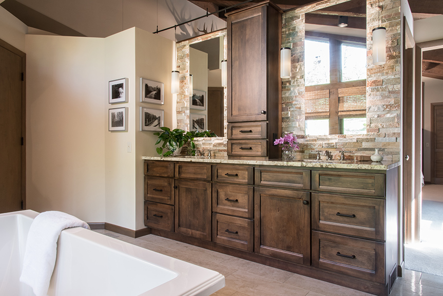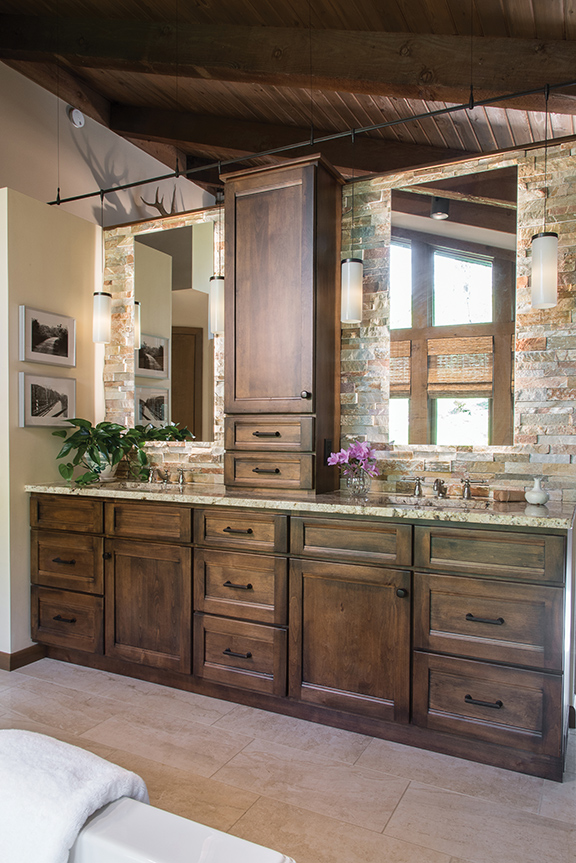 Located in a rustic area, this master bath captures the natural setting while providing all the modern comforts. Designer Mark Dysart, Marc Christian Fine Cabinetry, added wood paneling and beams to warm up the visual look of the space, while heated flooring enhances physical comfort. The vanity mirrors were built by first building 3” deep framework. LED lighting tape was applied to the frame, then the stacked stone tile backsplash was installed. The mirrors were overlaid on the stone to look as if they are floating.