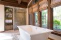 Flat mosaic pebble tiles are on the shower floor and around the tub, and round pebble tile accents the shower detail. Alder cabinetry was used for the vanities. A freestanding, customized linen cabinet provides ample storage. The freestanding tub sits in front of large, wood-framed windows for the ultimate outdoor viewing. The main shower was created out of a previous closet area with a main showerhead and hand shower added and placed to be accessible from the built-in seat. The master bath is warm, rich and comfortable in the surrounding environment.