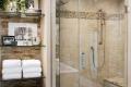 We can picture ourselves taking a bath in this space and relaxing. The beams the designer added are so cool, and the stacked stone is gorgeous. We love how the mirrors are hung on the stacked stone.
