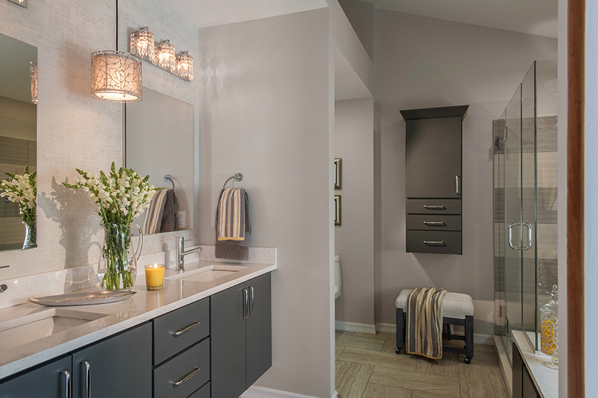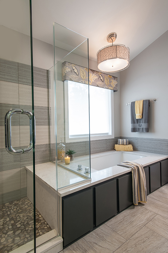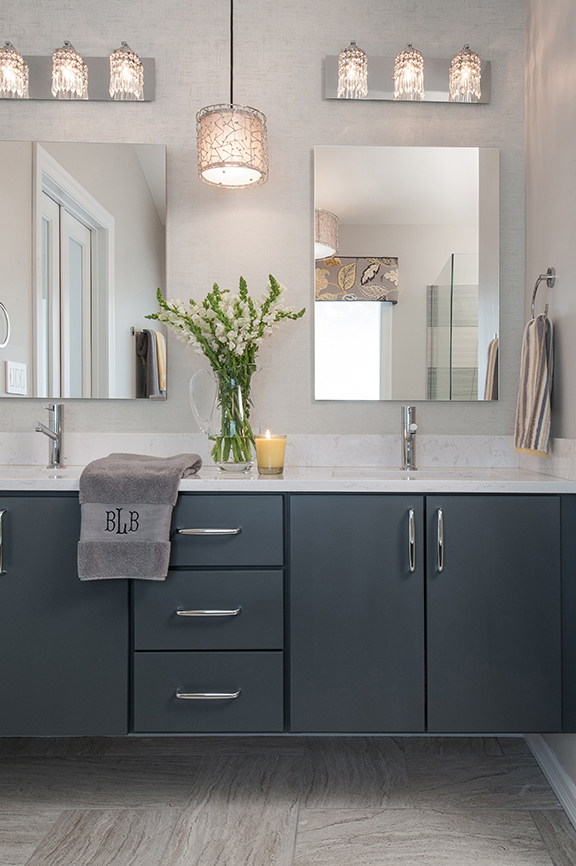 For a more open look, the wall that enclosed the commode was removed and a wall-hung vanity was specified. Multiple tile choices, in shades of gray, were applied to the floor and shower pan to create stripes on the shower walls and tub splash. The variety of tile and quartz surfaces make the monochromatic bones of the room interesting while keeping a clean look. Sparkle was added in the light fixtures and crystal embedded wallcovering on the vanity wall. Accent towels and accessories in gold complete the look.