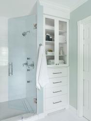 The designer, Lauren Sweet-Schuler, removed the unused tub allowing ample space to create the ideal luxury shower, which features marble finishes and state-of-the-art fixtures. Taking full advantage of every square inch, a custom built-in linen cabinet adds much needed storage. The vanity is a stunning showpiece with its custom mirrored front. Polished fixtures and hardware add a bit of sparkle. On the floor, Thassos, a pure white marble, is paired with iridescent Rivershell in a hand-laid basket weave. Classic clean lines and symmetry make this marble-lined master bath in perfect harmony.