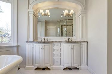 This beautifully designed bathroom is not over the top. We love the curved cabinetry and curved wainscoting panel. The tile detail is great, especially the way the designer incorporated the fleur de lis. The little pop of dark in the light floor tile carries the detail throughout the space.