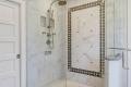 All the materials in the home are vetted, and protocols were created to meet and exceed guidelines for hazards such as lead paint and asbestos. The tile is all porcelain to avoid the need for sealing. The cabinetry was locally built and finished with low-emitting materials, and all the sealants, adhesives and caulks used were low or no VOCs as were primers and paints. Aesthetically, the bathroom integrates the iconic St. Louis Fleur de lis.