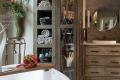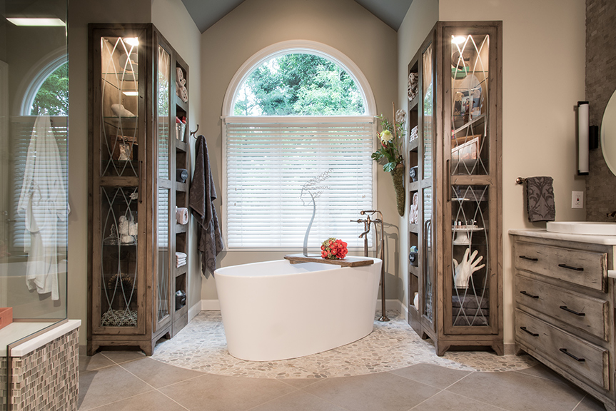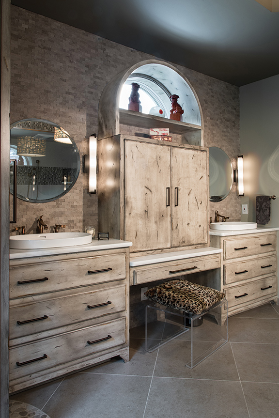 The custom cabinetry is totally tricked out with practical and impressive storage inside. In the glass cabinets flanking the freestanding tub, the client displays one-of-a-kind treasures. Designed to frame the lemon-slice window, the cabinetry creates a design detail that was once outdated in the original bath. Honed marble counters, porcelain vessel sinks and brushed bronze plumbing finishes complement the existing ceiling fixture while adding a chic flair to the space. This bath is a little bohemian with touches of contemporary panache set free by custom cabinetry that is so gorgeous it defies description.