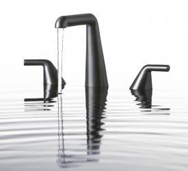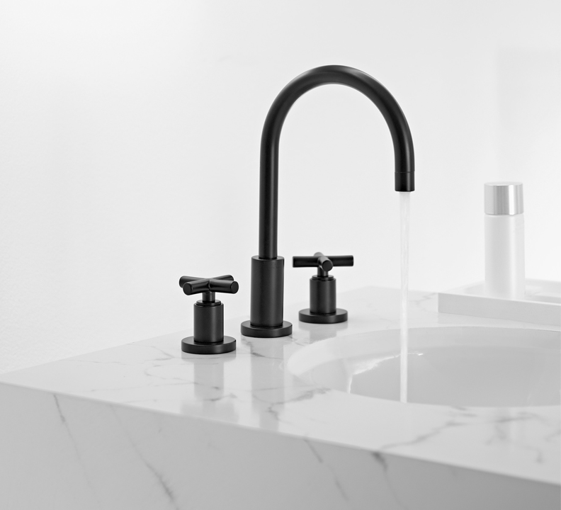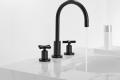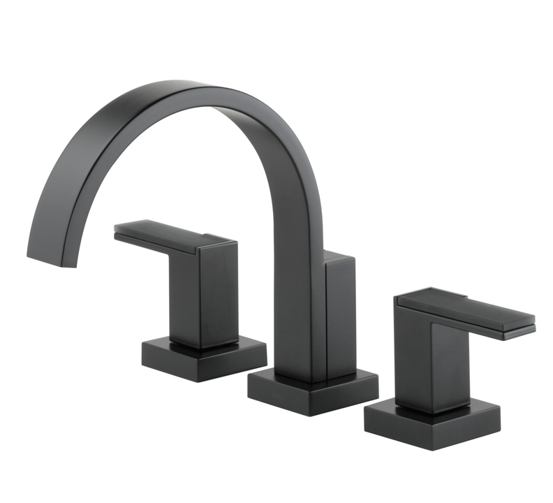 one: Sotria widespread in matte black, by Brizo, available at Premier Plumbing, Crescent Plumbing, Ferguson, Henry Kitchen & Bath, Callier & Thompson and Plumbing Haus.