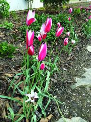 “This is tulip `Peppermint Stick'. It is one of the few deer-resistant tulips you can buy. It only grows 6"-8" high but will multiply and naturalize very nicely. It needs to be planted in the fall in sun-to-part shade and blooms mid spring. It makes a good front of the border plant. Too cute!” Cathy Pauley, Papillon Perennials.