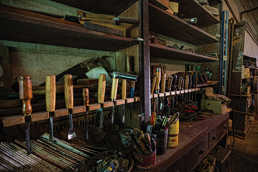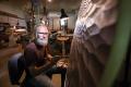 Regardless of what he's creating he always starts with cabinet-grade lumber. “I glue that together to make whatever it is I'm using as a beginning form, then for the sculptures I use a big lathe to establish the general shape. For the final carving, I always use traditional gouges—curved, chisel-like tools—to create the shape and textured surfaces that I like.”
