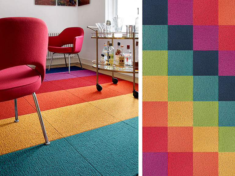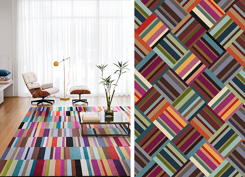 TWO: Citrus Spotlight Rug: Heaven Sent tiles in tangerine, marigold, kiwi, teal, indigo, persimmon and magenta. Above left: Sangria Stripe rug of all Heaven Sent tiles. Below: Same quantity of Heaven Sent tiles with each row shifted to create a diagonal patchwork.