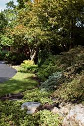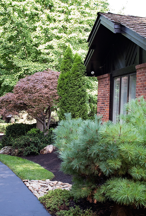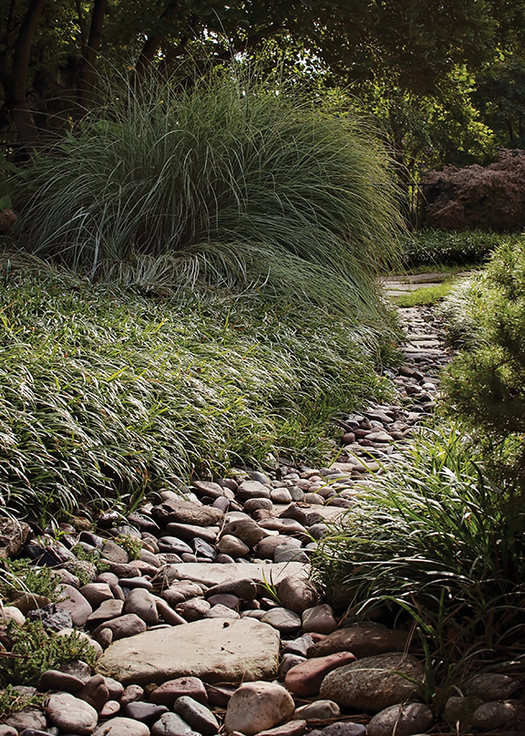 When the two began the project, Jim’s palette was almost non-existent. He was working with a few old trees and lots of overgrown shrubbery, most of which needed to go. Knowing Steve’s taste Jim settled on a “contemporary Asian landscape with a bit of rustic flair.” He began with a backdrop of indigenous ornamental trees such as dogwoods and redbuds and a screen of evergreens. He then splashed in some textural and architectural interest with a variety of lacey Japanese maples and year-round architectural interest with various conifers such as hemlocks, spruce, pines and false cypress and broadleaf evergreens such as boxwood and holly. Also knowing that Steve did not have time for a lot of gardening on his own, he worked toward a low-maintenance landscape utilizing flows of grasses, groundcovers and shade-loving perennials with only a few annuals to add an occasional pop of bright color.