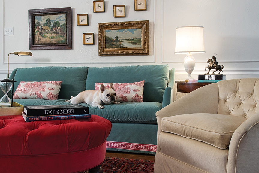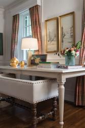 Vibrant with color, the living room showcases a green velvet sofa facing the wood-burning limestone fireplace, which is topped by an Andrew Millner ink artwork, and a large tufted ottoman in vivid raspberry that substitutes for a coffee table. Pastel plaid drapes flank the windows; a collection of family heirloom paintings is displayed above the sofa; and additional seating includes a botanical print settee and creamy beige barrel chairs that once belonged to the owner’s grandmother.