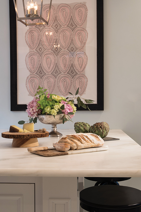 “I surround myself with what I like,” says the owner, adding with a smile, “I guess you might call it ‘boho traditional'." As examples, she points to the kitchen’s wire-fronted upper cabinets and the flooring in the kitchen and casual dining area, painted in a large checkerboard pattern for a “Swedish farmhouse look.”