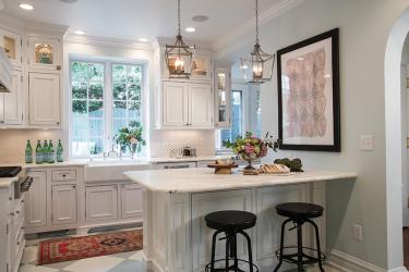 Although expanded, the kitchen’s dimensions didn’t allow for an island, but the peninsula provides plenty of functional workspace, with a Danby marble surface and an integrated oven and microwave drawer. Crackle-glazed Italian subway tile backs the 6-burner Wolf range and pot filler, an apron farmhouse sink overlooks the outdoor area and the “indispensable” coffeemaker has its own niche.