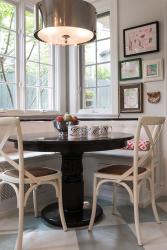 Open to the kitchen and lit by windows on two sides, the family dining/breakfast room required some ingenuity. The updated home combines the original radiant heating with forced air, and radiators were located in the corner where the owner wanted to place a banquette. The problem was cleverly solved by installing a custom banquette over the radiators, with decorative base grilles that allow the heat to circulate. To unify the space, the cabinetry, workstation and table were all custom-made in ebony-stained walnut.