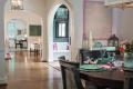 Now accessible from the foyer and kitchen, the formal dining room is centered by a tobacco-stained table and graceful, open-weave cane-backed chairs with comfy upholstered seats. Many of the new furnishings were sourced by designer Marci Marsh, of Frill, who also suggested the dining room’s unique ceiling treatment – wallpaper in a pewter metallic trellis pattern, framed by the original plaster bead and contoured to extend into the new bar alcove.