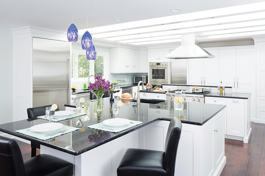 The biggest challenge in the kitchen was making use of the large space. This was done by breaking up the functions and rethinking the space. The pantry is located along the back wall using full-height cabinetry. A separate refrigerator and freezer in different areas give easy access to the refrigerator, which needed to be centrally located for access to the kitchen and breakfast room. The sink remained at the window and became the cleanup area. The kitchen features a two-island design. One island includes the range top with the prep sink on the other island. The prep island is T-shaped to allow for seating and interaction with the cook. The cabinetry is frameless with recessed panel doors in a white-painted finish. Stainless steel appliances and a glass tile backsplash provide a fresh new look that will carry the kitchen forward for many years.