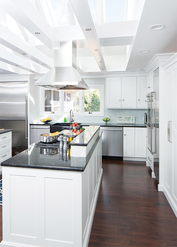 It was time to bring this 1980s contemporary kitchen up to current times. Gegg Design & Cabinetry worked with the homeowners to improve the functional flaws of their previous space. While no walls or windows were moved, this was a major transformation of the kitchen. Gone are the curved corners, mirror backsplashes and gold accent channel doors. One great feature that stayed is the large skylight in the open beam section of the ceiling. This feature helped the room feel taller and was enhanced with LED lighting to illuminate the space at night.