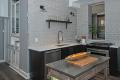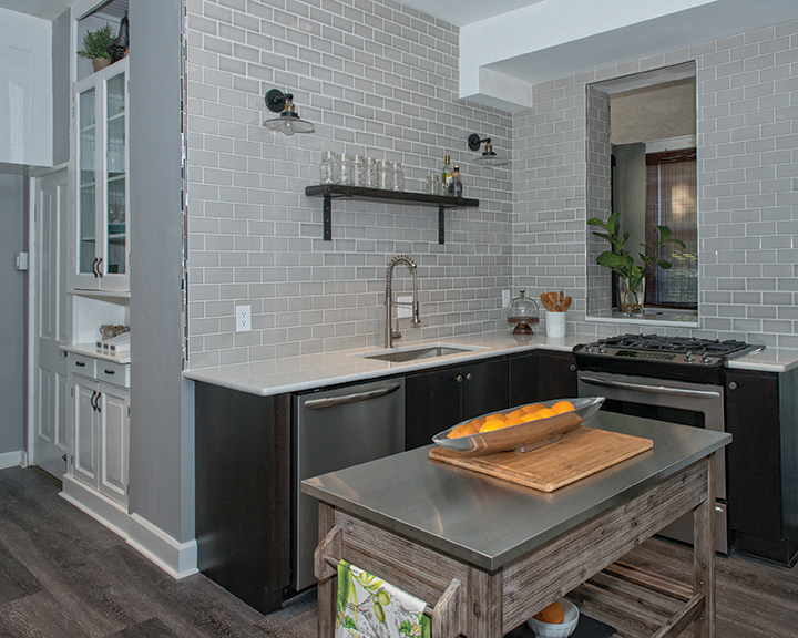 The original 1903 built-in cabinetry was retained and houses dishes, a microwave and small appliances. The new cabinetry is quarter-sawn oak in a java stain with a flat front as to not compete with the original cabinetry. A stainless-steel island with drawers adds additional storage space. To create an open, airy and spacious kitchen, the walls were tiled up to the ceiling, and a reclaimed shelf was placed between two wall sconces. The decorative metal linear tile is a unique, modern detail. As with any older home, the subfloors had high and low spots, so a Coretec LVT flooring was used to overcome flooring imperfections and provide an unexpected wood-floor design in this century old home.