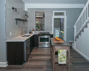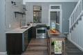 This shotgun-style house on The Hill had an L-shaped kitchen that was divided into two sections by the refrigerator. In need of modern conveniences, such as a dishwasher and good lighting, the goal of the renovation project was to respect the history of the home while making the kitchen functional and aesthetically pleasing. The new design by Ginger Interiors LLC relocated the refrigerator under the stairs with a storage pantry featuring a custom-made sliding door.