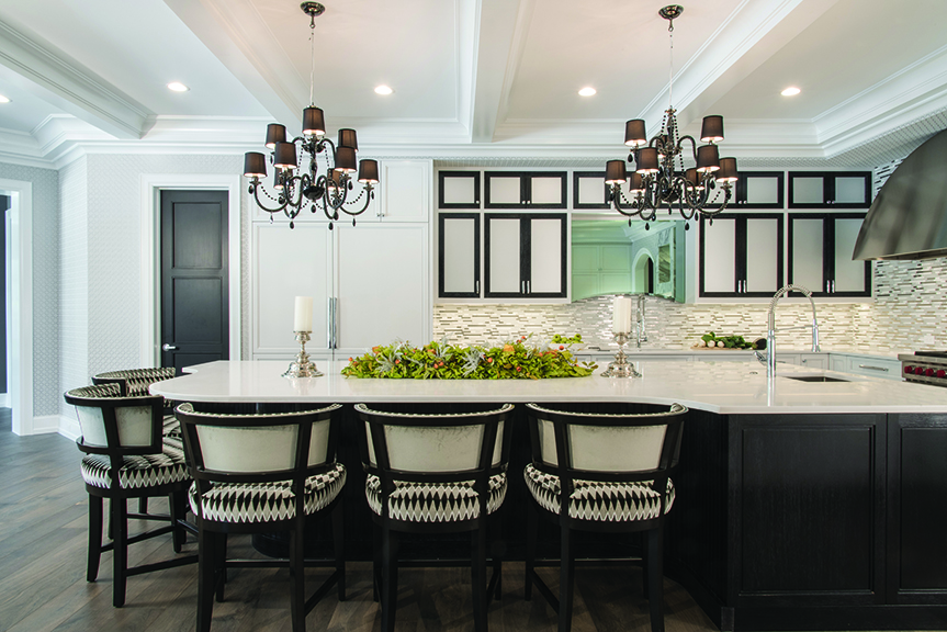 The island is designed with a curving bead-board back for the seating area. Pure white Caesarstone countertops finish off the cabinetry and emphasize the unique winding shape of the island. The clean lines and sparkling finishes of the kitchen create a visual masterpiece for the hub of this custom home.