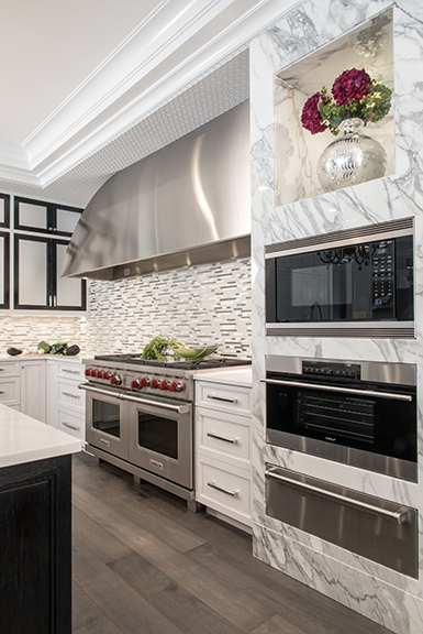 This 425-square-foot kitchen designed by Marc Christian Fine Cabinetry was designed for entertaining, gourmet cooking and everyday family meals. An oversized stainless-steel hood is the focal point of the space with its sleek curves and striking design. A wall of marble incorporates the Wolf microwave, warming drawer and steam oven. Custom European frameless cabinetry in a semi-gloss sheen offers ample storage space and emphasizes the beautifully clean lines. The perimeter cabinets are painted white, while the island is a cerused ebony stained red grandis. The wall cabinets contrast all other cabinetry with white-painted frames and red grandis inset doors with opaque glass inserts.