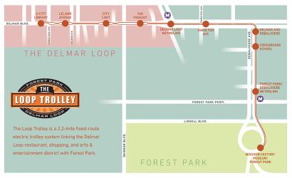 The 2.2-mile Loop Trolley will run along Delmar Boulevard and DeBaliviere Avenue, connecting the restaurants, shopping and entertainment of The Loop with Forest Park. In The Loop, the trolley will operate in drive lanes joining vehicular traffic. There will be 10 designated trolley stops for passengers to hop on and off.