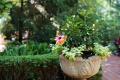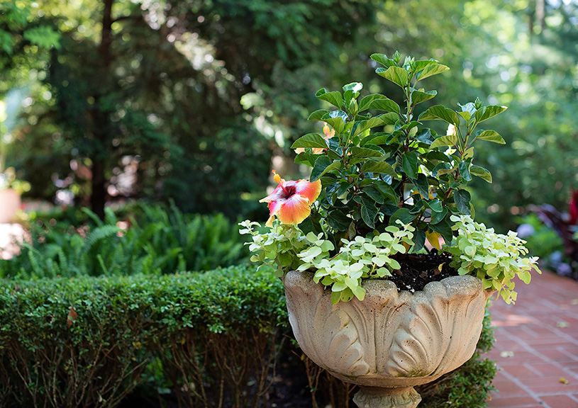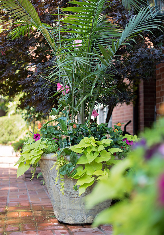 The homeowner had a house in Naples, FL, as well as St. Louis, and she loves the tropical look of the foliage surrounding her Florida home. In summer, she brings that look to her patio up north. “The patio is the one place we have full sun,” Rand explains. “We put a lot of color in containers and use a lot of tropicals. She loves palms. We have bright hibiscus, both in tree form and tucked in with smaller plants. She loves the color of mandevilla vines.” Rand often trains the mandevillas to grow up through the palms.