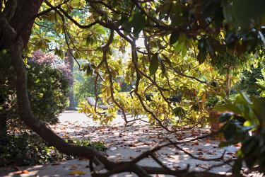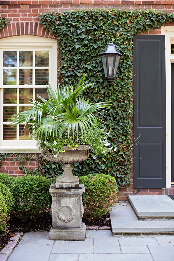 The other hallmark, the magnolia at the back of the house, is probably technically in the wrong place. Undoubtedly planted many, many years ago as a small sapling, the tree has thrived despite being surrounded on all sides by brick. Grown more beautiful each year, it has been allowed to branch naturally with limbs that curve and dip toward the ground. “I think the tree was there before she moved in,” Rand says. “She really babies it. She is very diligent; she has an arborist come out regularly and fertilize it and brace branches. Whenever we are working here, she has us put a soaker hose on it. She loves to cut the blossoms and float them in the fountain when she has parties. They have a light lemon scent.”