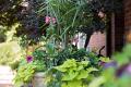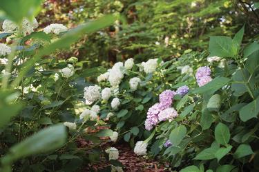 Rand has used a number of different hydrangeas so that one hydrangea or another will be blooming from early summer through fall. Because the blossoms stay on the plant and change color as they age, all have a long season of interest.